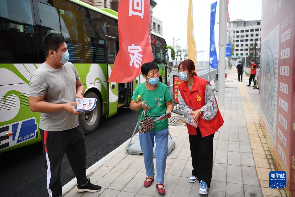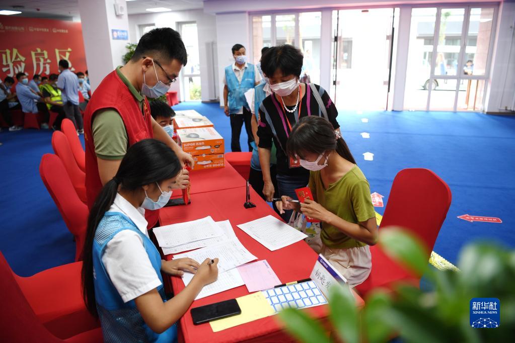 8月26日,回迁居民(中)在雄安新区雄东片区A单元安置房交付点向志愿者咨询交付事宜。
