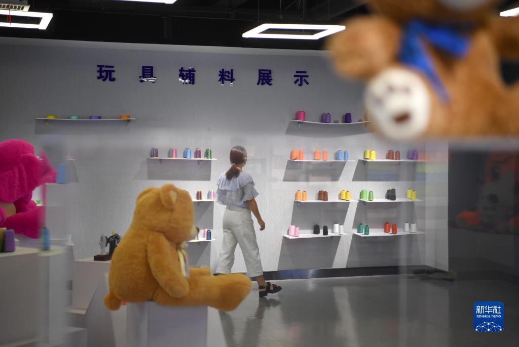 游客在参观安康毛绒玩具文创产业五大中心内展示的毛绒玩具辅料(2022年8月18日摄)。