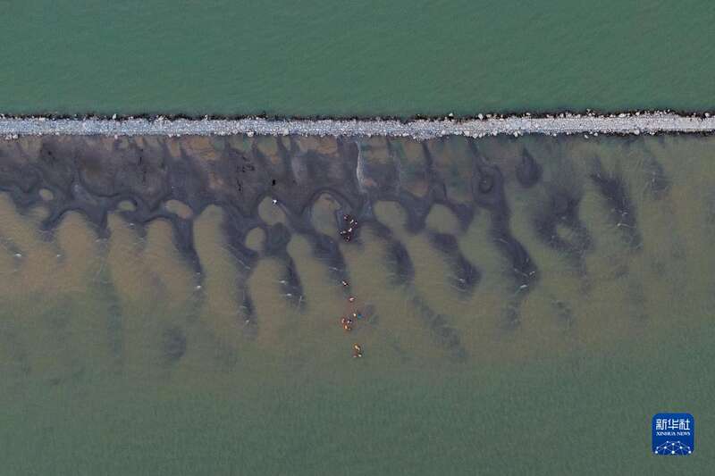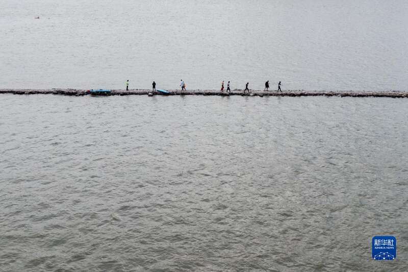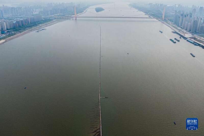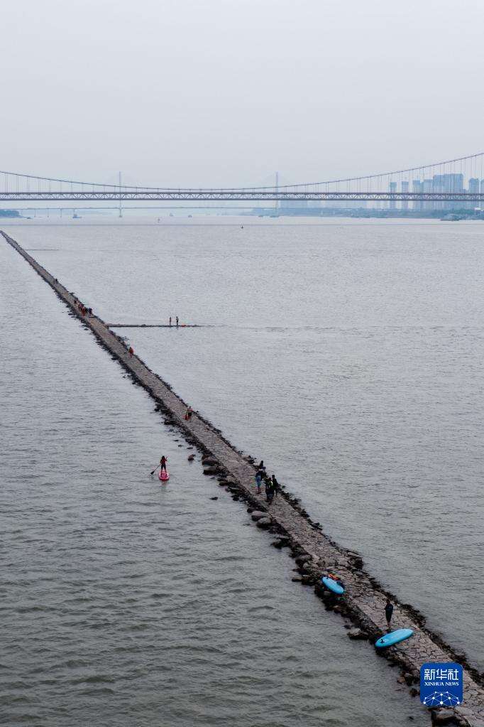 9月1日,长江武汉段露出一条江心小道(无人机照片)。