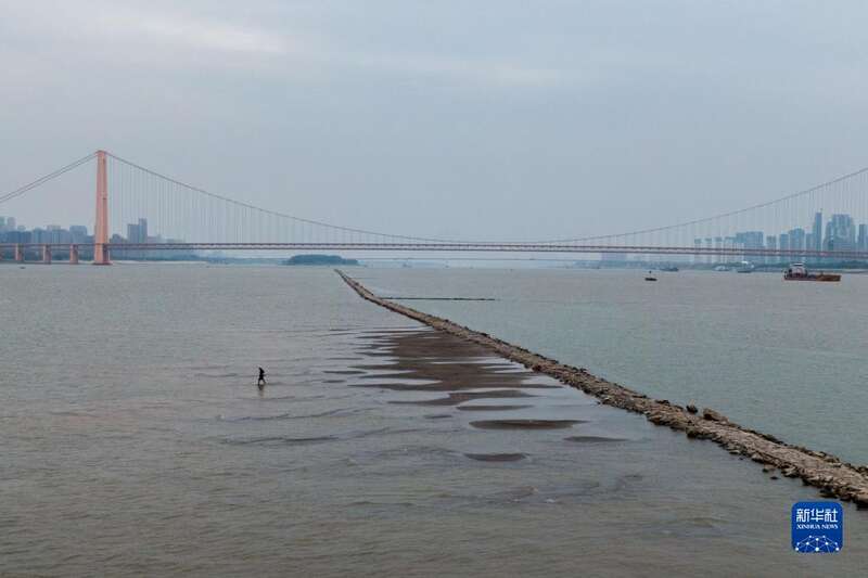近日,长江武汉段水位持续降低,一条江心小道露出江面。截至9月1日20时,长江汉口站水位为14.67米,远低于历史同期平均水位。