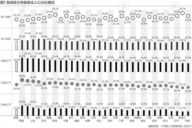 我国就业人口中,40岁以下占比为45.3%,其中有7个省份超过了50%,西藏、广东、上海、北京、天津位居前五。