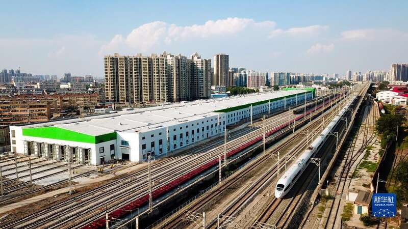 9月1日,一列高铁驶过济(南)郑(州)高铁济南站动客车整备所(无人机照片)。新华社记者 郭绪雷 摄