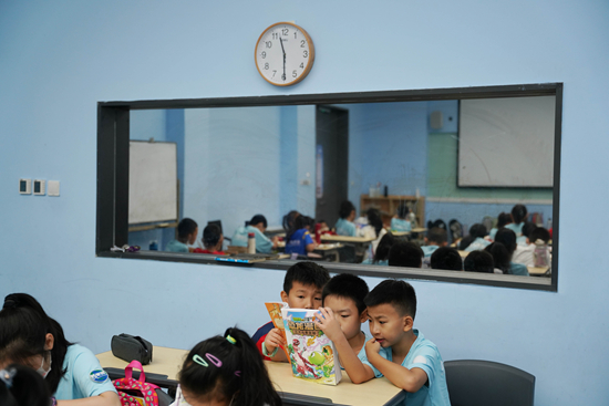 7月18日,北京的一所托管班内,马克(右)和朋友们一起看漫画书。相较双减之前,今年报名上托管班的人数增多,班上有20多个小朋友,上午在教室里做作业、看书,下午进行体育锻炼和游戏。