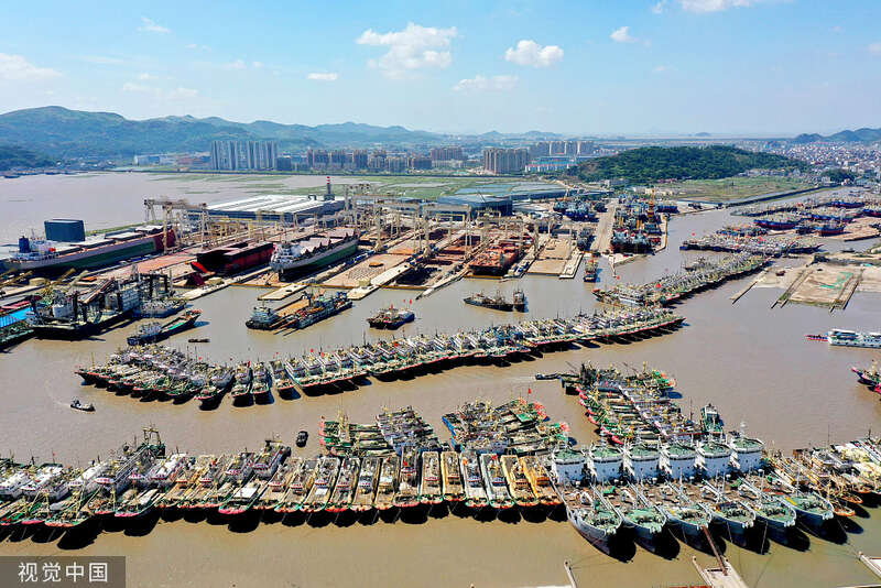 2022年9月1日,浙江省台州市,温岭市松门礁山港,回港渔船有序停泊在港湾避风。视觉中国 图