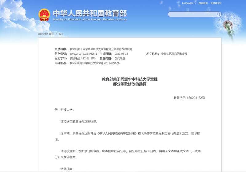 近日,教育部核准华中科技大学对于学校章程的修正,其中提到,将第二条修改为:“学校名称为华中科技大学,简称华中大、华科大……”