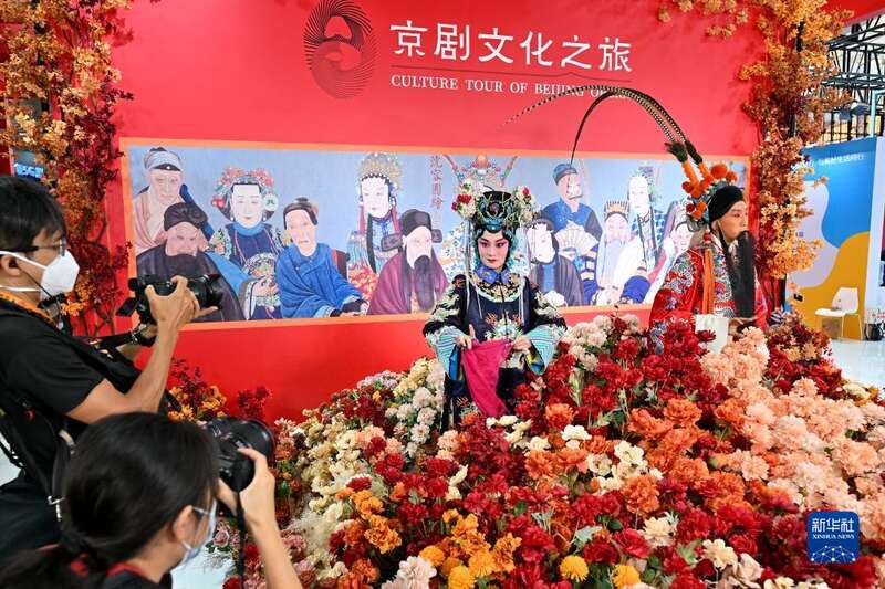 9月2日,在文旅服务专题展区,观众在北京文旅展台拍摄京剧表演展示。
