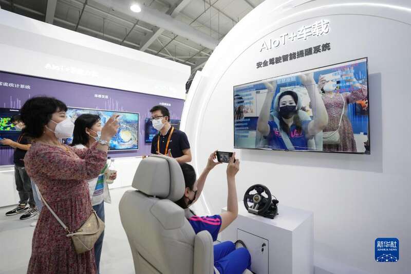 9月1日,在电信、计算机和信息服务专题展区,参观者在体验一款安全驾驶智能提醒系统。