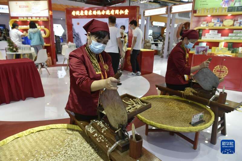 9月1日,在健康卫生服务专题展区,工作人员在展示中药材加工技艺。