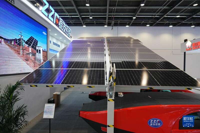 9月2日在环境服务专题展区拍摄的光伏跟踪模块系统。