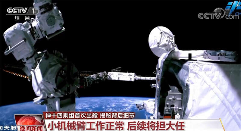 此次出舱活动,问天舱小机械臂大展功效。问天小机械臂的主要功能和天和大机械臂类似,它能真实模拟人手臂的灵活转动,通过旋转结构能在前后左右的任何角度和部位抓取物体,并且可以在问天实验舱表面进行爬行。