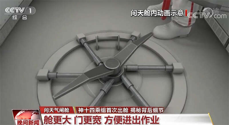 问天实验舱是中国空间站首个实验舱段,神舟十四号乘组的这次出舱活动也是首次从问天实验舱的气闸舱实施。现在我们看到的就是问天实验舱的出舱口,此次出舱任务,航天员陈冬和刘洋就是通过这里进行出舱活动。它的直径是一米,比之前“天和”节点舱舱门更大,这样,航天员出入“家门”也更加轻松自如。