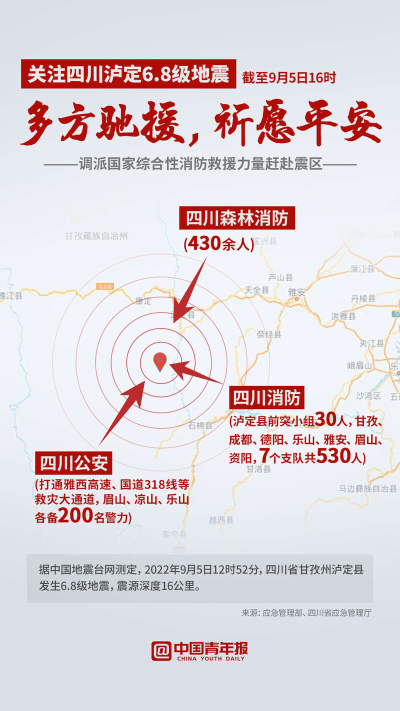 截至今日16时,四川消防除泸定县前突小组 30 人赶赴震中核查灾情外,已紧急组织7地7个支队共 530人赶赴震中;四川森林消防出动430余人赶赴震中救援,云南、甘肃森林消防共1700人已做好增援准备;四川公安全力保障,高速公路地震救援绿色通道已开启……各方救援力量正陆续抵达现场。