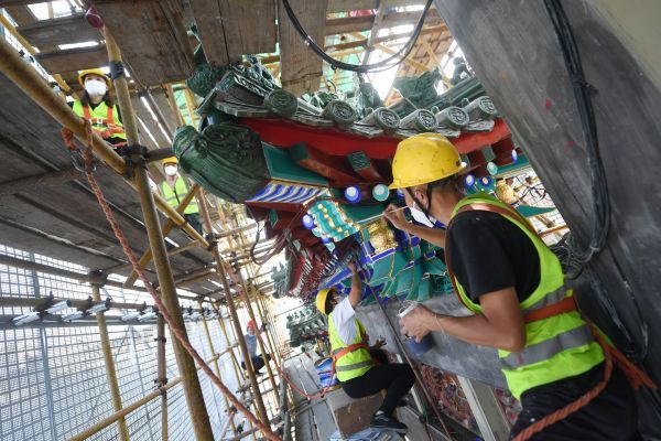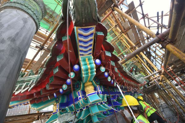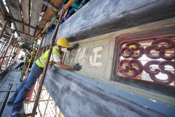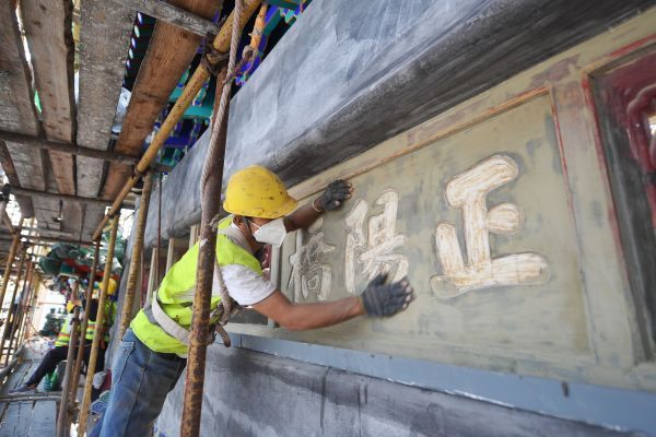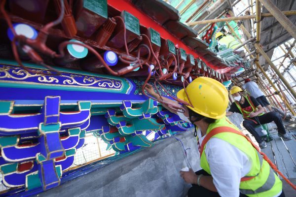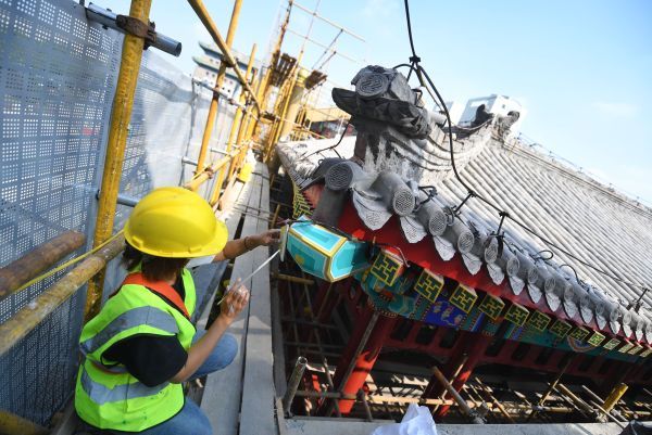 2022年9月15日,北京,中轴线正阳门箭楼,施工人员开展维修工作。