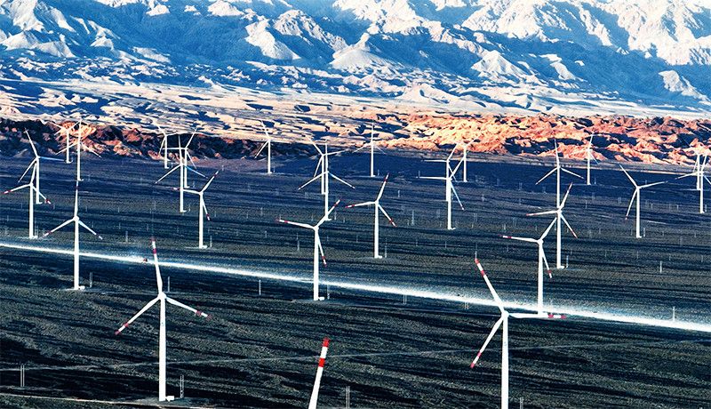 2022年5月21日,新疆生产建设兵团六师北塔山牧场刚刚建成的风力发电场风机林立,一派壮观的场面。 人民图片 王志清/摄