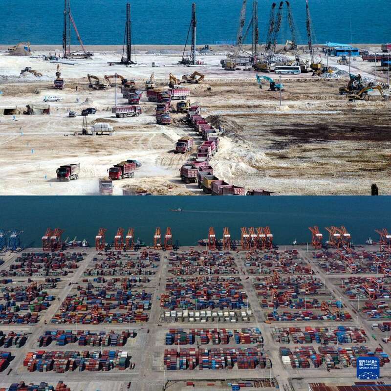 拼版照片:上图为钦州港集装箱码头建设期间的施工场面(2009年5月5日摄,钦州市档案馆提供);下图为钦州港集装箱码头(2022年8月28日摄,无人机照片)。