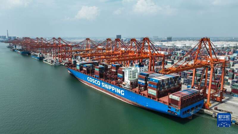 多艘海轮停泊在钦州港集装箱码头装卸货物(2022年9月13日摄,无人机照片)。