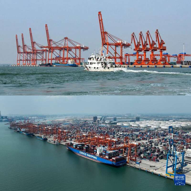 拼版照片:上图为2010年的钦州港码头作业区 (2010年11月29日摄);下图为2022年的钦州港码头作业区(2022年8月28日摄,无人机照片)。
