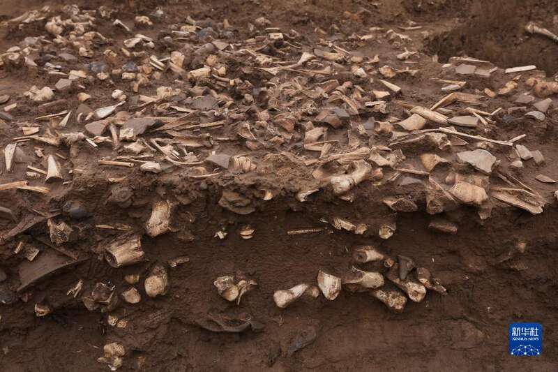 洹北商城制骨作坊骨料坑H32局部堆积情况(资料照片)。