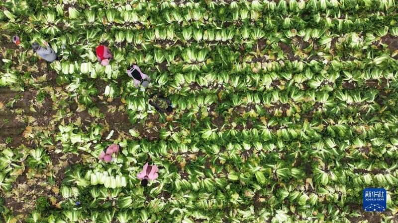 11月28日,山东省临沂市郯城县马头镇圩东村菜农在收获大白菜,确保市场供应(无人机照片)。
