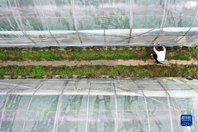 11月28日,农户在浙江省乐清市石帆街道大林村西红柿种植基地加固大棚,做好抵御寒潮的准备工作(无人机照片)。