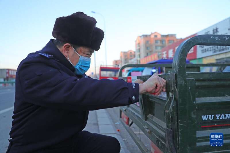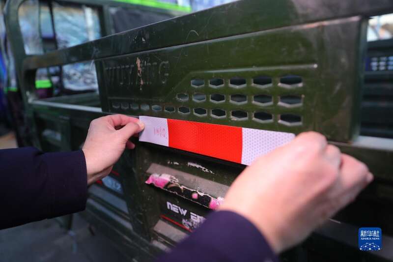 12月1日,沈阳市公安局交通警察局苏家屯大队交警给农用三轮车粘贴反光条。
