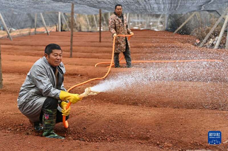 12月13日,村民在丹寨县兴仁镇茶叶育苗基地给苗床浇水。