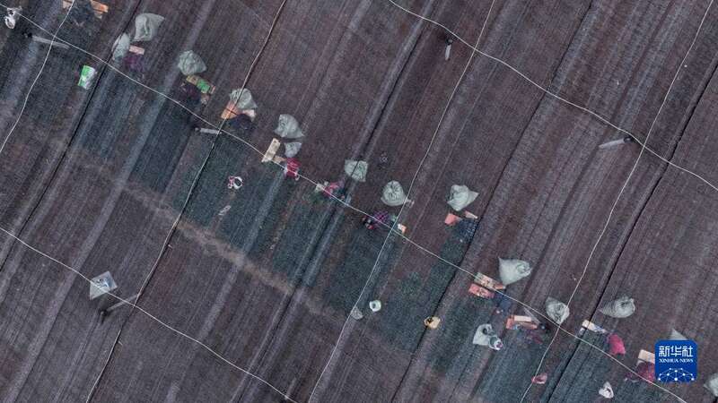 12月13日,村民在丹寨县兴仁镇茶叶育苗基地扦插茶苗(无人机照片)。