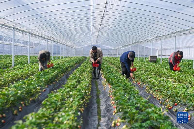 12月15日,在建德市乾潭镇的草莓产业“共富工坊”大棚内,草莓种植户在采摘草莓。