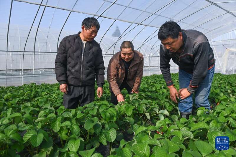 12月15日,在建德市乾潭镇的草莓产业“共富工坊”大棚内,草莓种植大户仇小明(中)指导种植户注意温度和湿度变化。