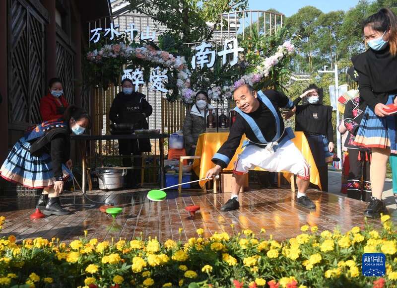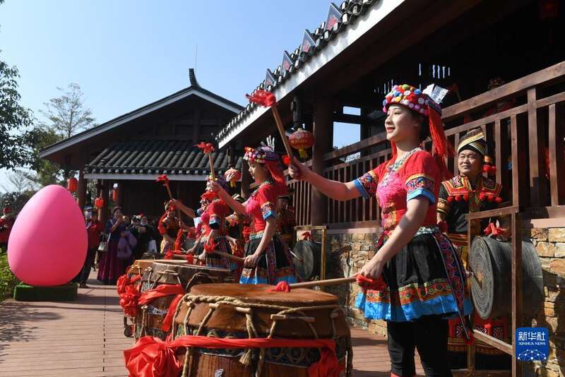 12月15日,人们在广西河池园博园敲鼓迎宾客。