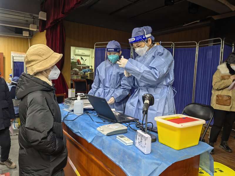 12月16日,北京市丰台区卢沟桥社区卫生服务中心保健科长张颖(右一)和同事在接种现场。(受访者供图)
