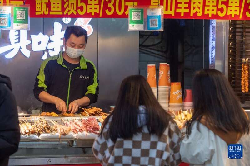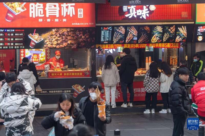 12月23日,在位于重庆解放碑商圈的八一路好吃街上,市民游客挑选小吃美食。