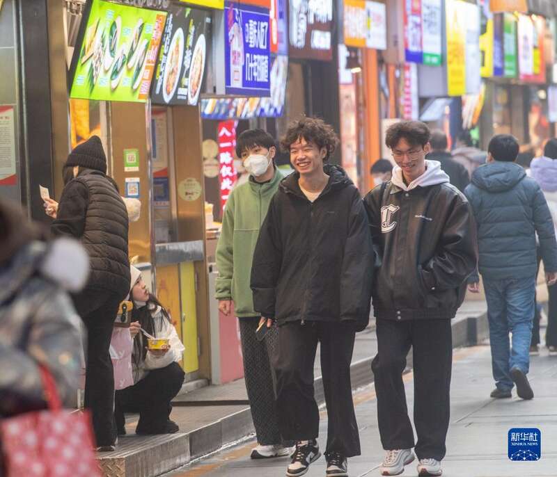 12月23日,年轻人在位于重庆解放碑商圈的八一路好吃街上逛街。