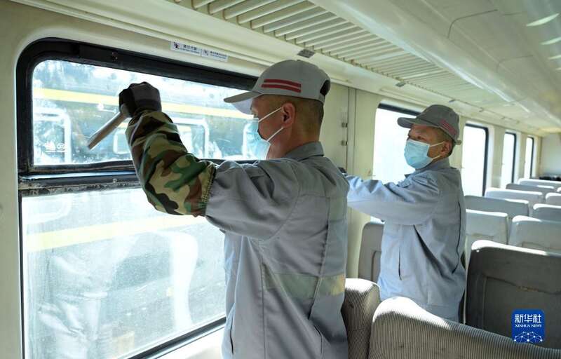 1月4日,在中国铁路上海局集团有限公司合肥车辆段合肥客车整备场,工作人员对旅客列车车窗进行整修。