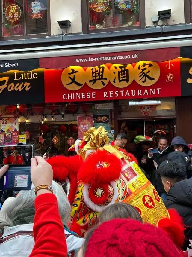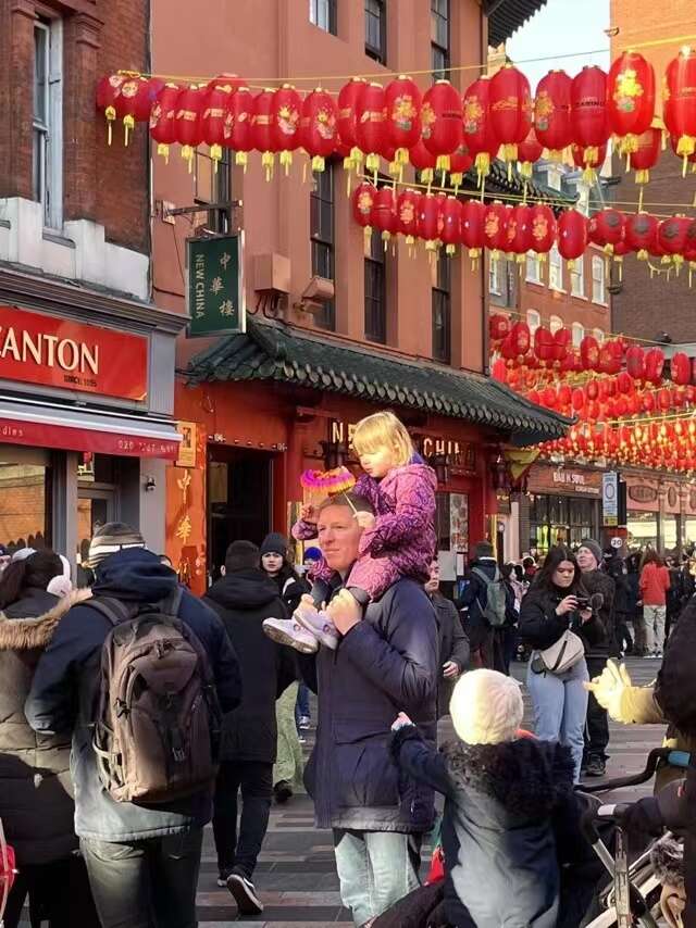 不只是留学生,伦敦的华人乃至伦敦人也拼凑出了一个够格的中国年。Miko的男朋友是英国人,我们惊诧于他对中国年的了解。当春晚的第一个节目中全都是兔子的形象时,他很自信地说:兔年。小品对他而言理解起来稍有难度,但在我们的比划和解释中,他也能看懂一点春晚。当我们点的外卖送到家门口时,开门后棕色皮肤的外卖小哥第一句话就是:你们是中国人吗?得到肯定回答后,他像印度司机一样送上了一句新年快乐,并祝我们用餐愉快。在同一时间的另一个空间,我的留学生朋友给我发来了伦敦中国城的照片:围观舞狮的人群,还有一个金发小孩坐在父亲肩膀上玩小纸龙。在中国城的正中央,一个舞台正在搭建,为正月初一的华人春节表演做准备。