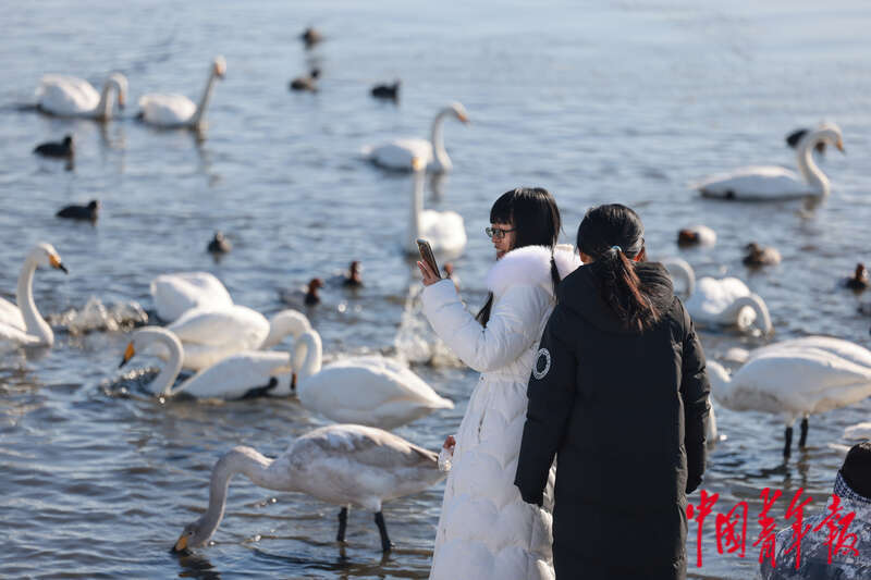 1月25日,农历大年初四,山东荣成樱花湖边,人们在观赏大天鹅。前一天,当地普降暴雪。山东荣成是我国大天鹅重点迁徙栖息地。每年冬天,从西伯利亚等地南迁越冬的大天鹅都会在此栖息,成为当地冬日生活中的一片独特风景。春节期间,观赏大天鹅也成了不少居民外出游玩的不二之选。中青报·中青网记者 曲俊燕/摄