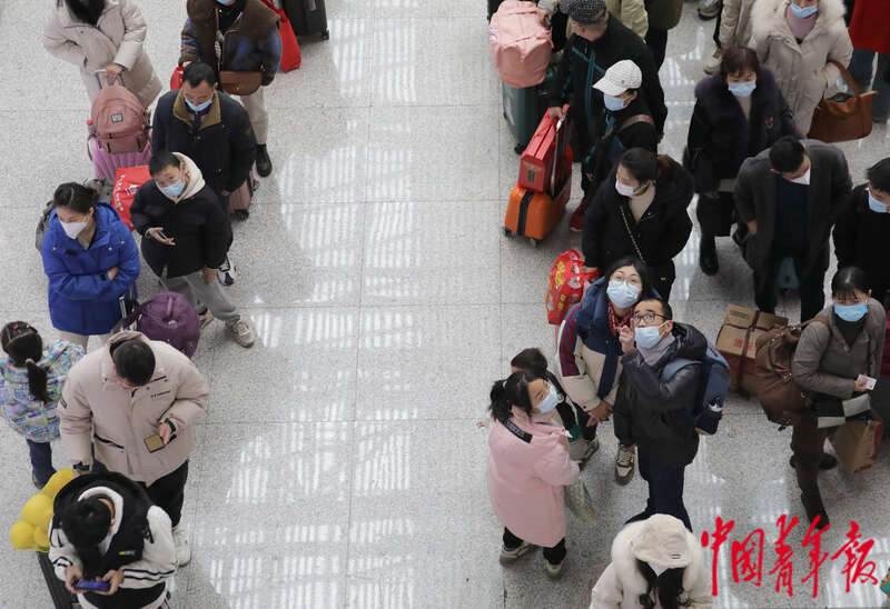 1月25日,重庆北站候车大厅,候车队伍中,一家人抬头查看列车时刻表。当日,各地迎来第一波返程客流。受寒潮天气影响,我国南方大部分地区出现降温及降雨天气,铁路部门采取多种措施,保证旅客的顺利返程。中青报·中青网记者 陈剑/摄