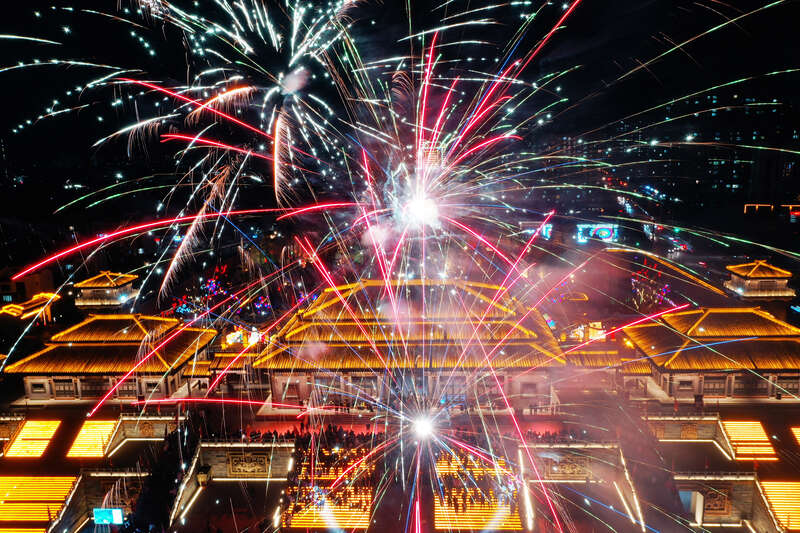 1月27日晚,游客在山东省郯城县郯国古城景区观赏烟花(无人机照片)。1月27日,文化和旅游部公布2023年春节假期文化和旅游市场情况。经文化和旅游部数据中心测算,今年春节假期全国国内旅游出游3.08亿人次,同比增长23.1%。实现国内旅游收入3758.43亿元,同比增长30%。全国文化和旅游市场总体安全平稳有序。新华社发(张春雷 摄)