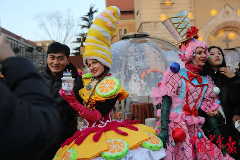 1月25日,山东青岛,市民、游客与身着趣味装扮的外国演员合影。春节假期期间,青岛的历史街区举行了丰富的新年活动,许多人前来感受热闹年味儿,体验老城文化。中青报·中青网记者 孔斯琪/摄
