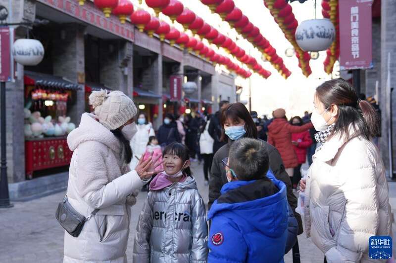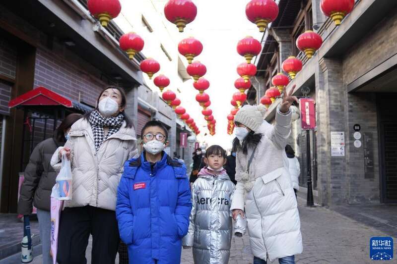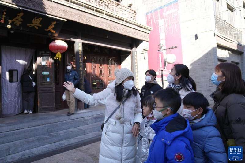 1月28日,在北京市东城区鲜鱼口街,导游何静(左一)在为游客讲解。