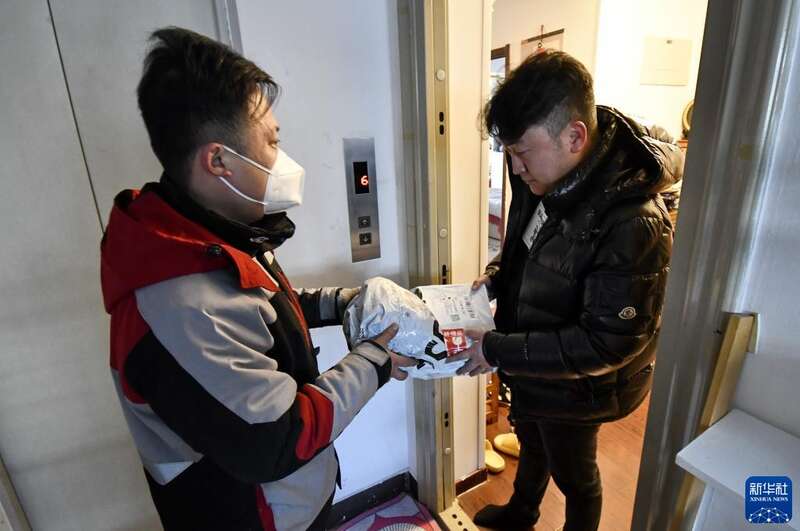 1月28日,顺丰速运快递员杨敬山在北京市海淀区中关村街道希格玛社区的一座住宅楼内送兔年开工第一单快件。