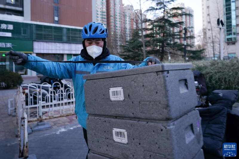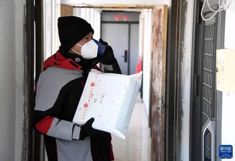 1月28日,顺丰速运快递员蒋双建在北京市朝阳区青年路某社区送兔年开工第一个工作日的第一单快递。