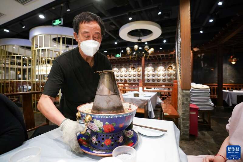 1月28日,在北京东来顺饭庄总店,服务员刘玉成在为第一桌客人上火锅。