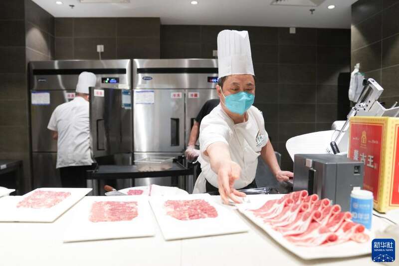 1月28日,在北京东来顺饭庄总店,厨师冯炳山在切节后开工第一天的第一盘鲜羊肉。