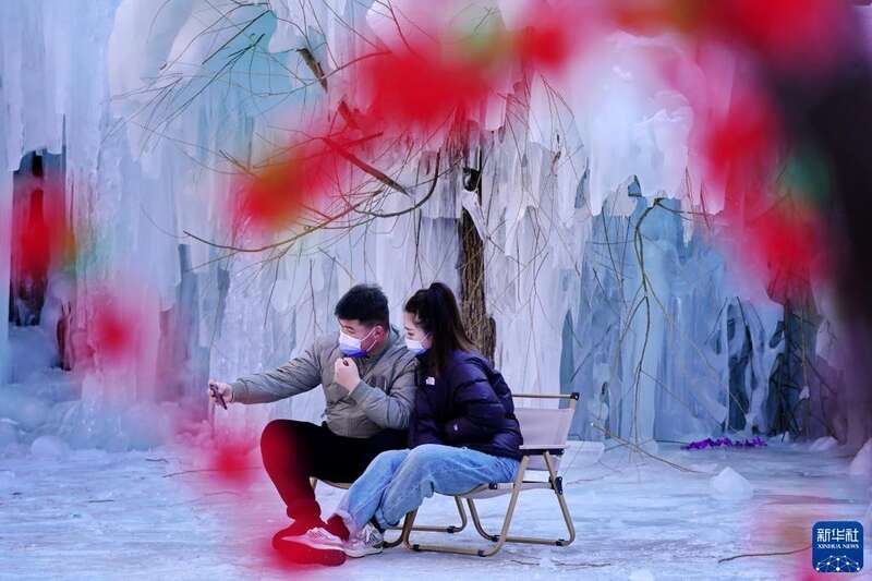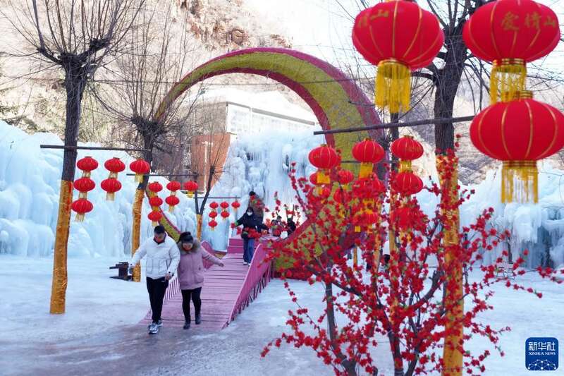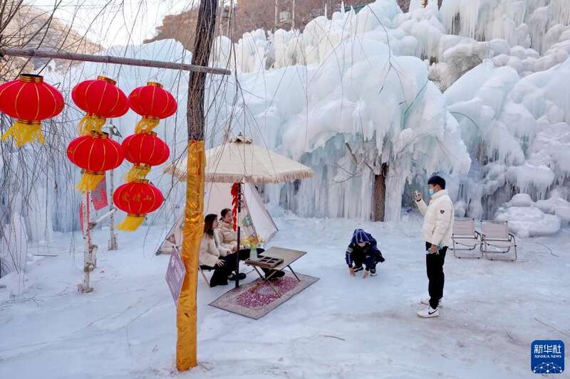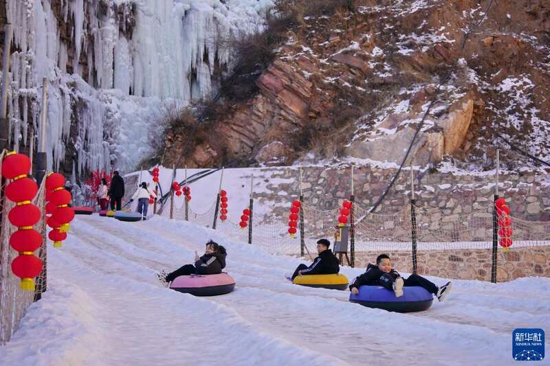 正月里,位于太行山深处的河北省邢台市天河山景区迎来众多游客。人们脚踏冰雪,在这里体验雪地游乐设施,欣赏冰瀑美景。