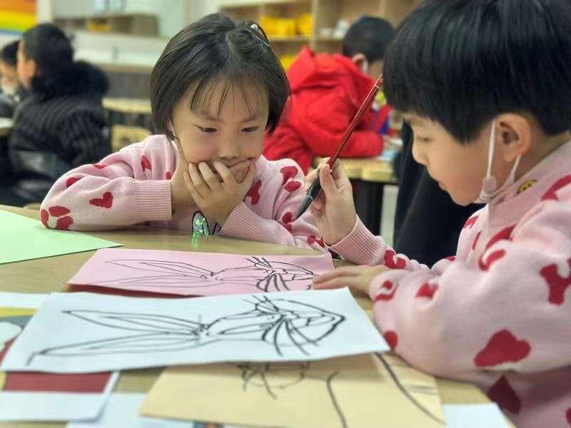 小朋友们画得认真、专注,他们先用铅笔画出自己喜欢的兔子形象,然后再用毛笔勾勒。不一会儿,一只只可爱的兔子便呈现了出来,长长的耳朵,标志性的兔牙。画纸上,有的兔子在吃胡萝卜,有的兔子在放鞭炮……小朋友们根据兔年这个主题开展了充满想象力的创作,绘制了自己心仪的作品。