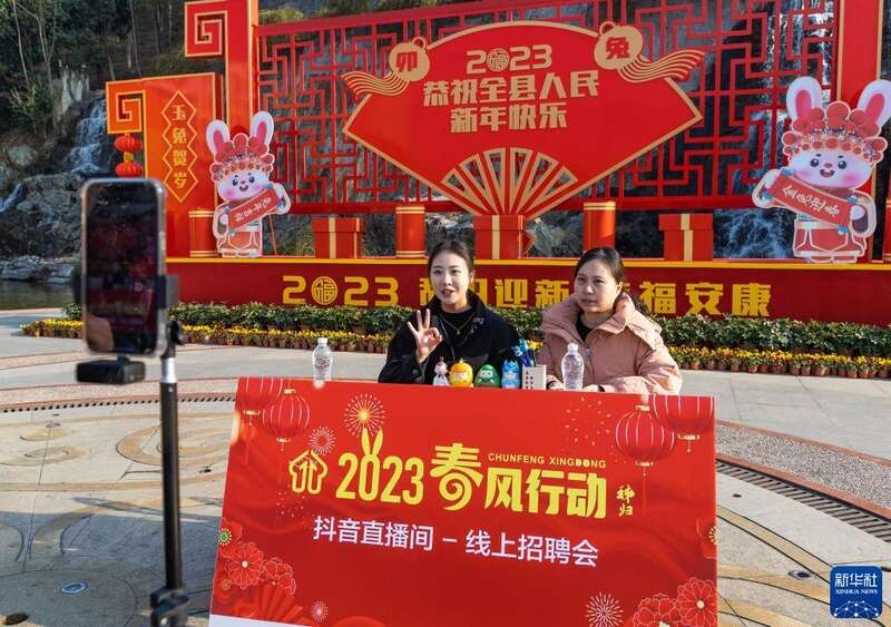 1月29日,在山东省临沂市沂南县举行的2023年“春风行动”暨“就业援助月”现场招聘会上,一家用人企业通过线上、线下相结合的方式介绍招聘岗位信息。