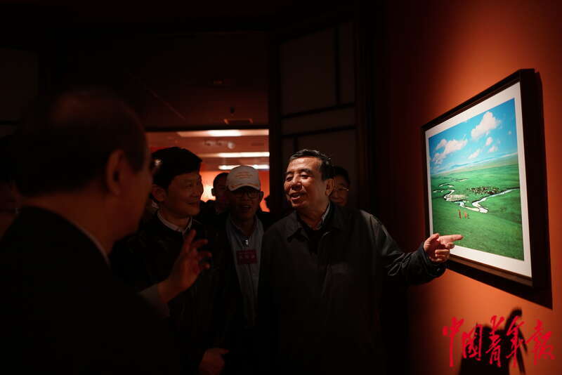 4月1日,中国美术馆,内蒙古摄影家协会名誉主席额博向参加当天摄影展开幕式的嘉宾介绍自己的参展作品《美丽的草原我的家》。当天,内蒙古摄影师袁广明等参展摄影师也来到了现场,向参观者介绍自己的作品。中青报·中青网记者 李强/摄