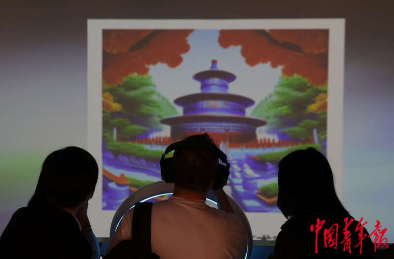 4月2日,北京新华书店·为宝书局,人们在AI人机共创艺术空间,“创作”以中轴线为主题的艺术想象画。中青报·中青网记者 陈剑/摄