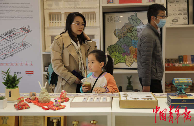 4月2日,北京新华书店·为宝书局,人们在文创展示区驻足。据介绍,书店除了陈设《中轴线》《北京中轴百年影像》等千余种图书,还有以中轴线为主题的玩具、文具、饰品、摆件等精美文创产品,以及以中轴线为灵感来源的特色饮品。中青报·中青网记者 陈剑/摄